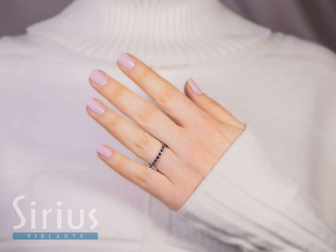 The 0.72-carat sapphire ring set in 14K white gold represents timeless sophistication and symbolic beauty. Masterfully handcrafted, this ring, with its sapphires set all around, is a true eye-catcher. As a high-quality sapphire ring, it combines intense color with modern design.