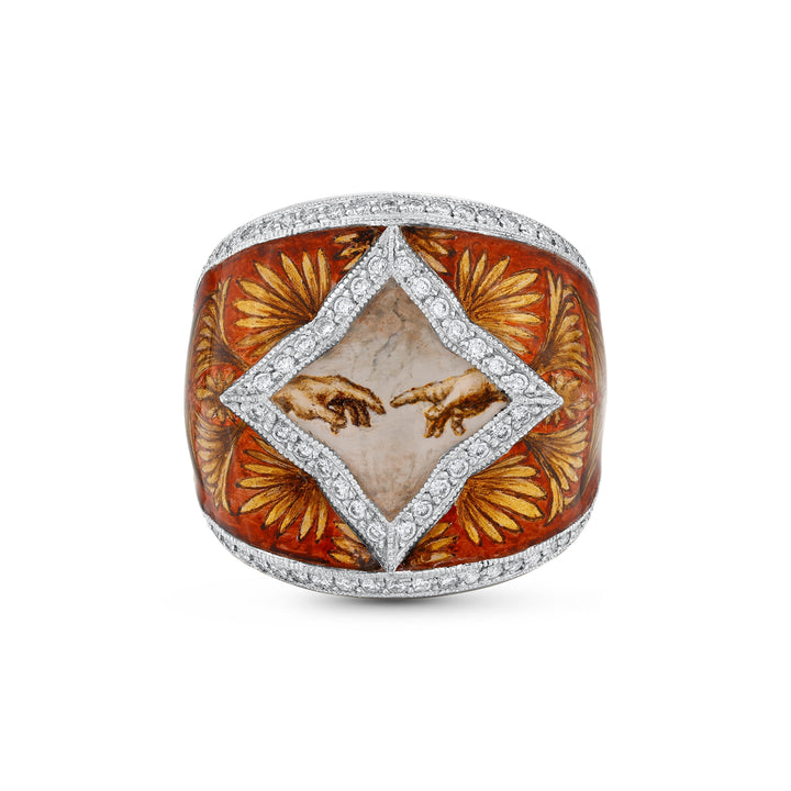 Our exquisite work, the Hand-Painted Adam's Seal Ring by Michelangelo Buonarroti, is a true masterpiece in the world of artisanal jewelry. Genuine diamonds add an extra touch to this already remarkable design. Precisely crafted, this ring is composed of a blend of 24-karat gold and 925 sterling silver, creating a luxurious contrast that catches the eye. Offering a striking and unique appeal, this ring is a standout accessory for those who appreciate fine craftsmanship and distinctive style. This hand-painted creation is not just a ring; it's a wearable work of art that transcends traditional jewelry art. Perfect for those who want to make a statement, this ring is a testament to individuality and a sumptuous luxury gift for connoisseurs of unique and exceptional works of art.