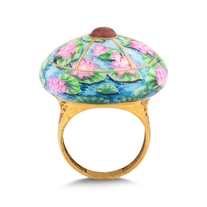 Discover our beautiful Lotus Ring, an authentic work of art that skillfully combines traditional craftsmanship with timeless elegance. Crafted from 24-karat gold and 925 sterling silver, this statement ring showcases a finely crafted lotus flower, symbolizing beauty and purity. At the center of this creation shines a luminous 0.87-carat natural tourmaline, lending the design an elegant and vibrant depth of color.