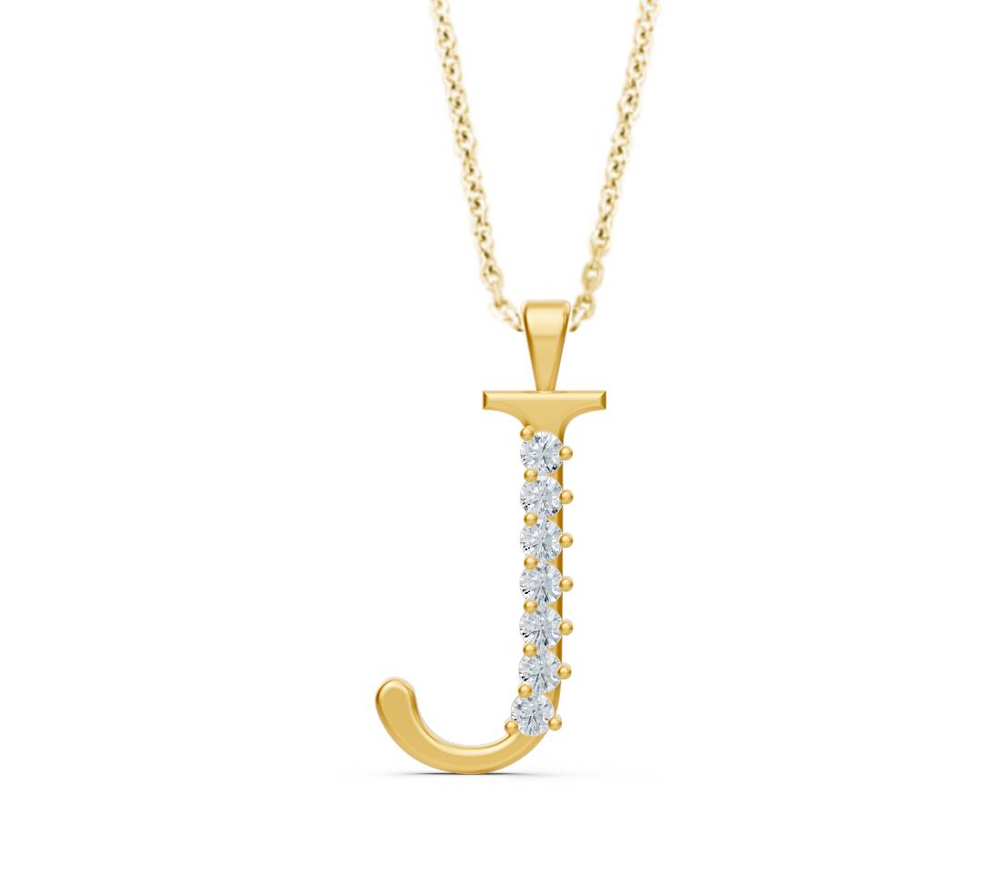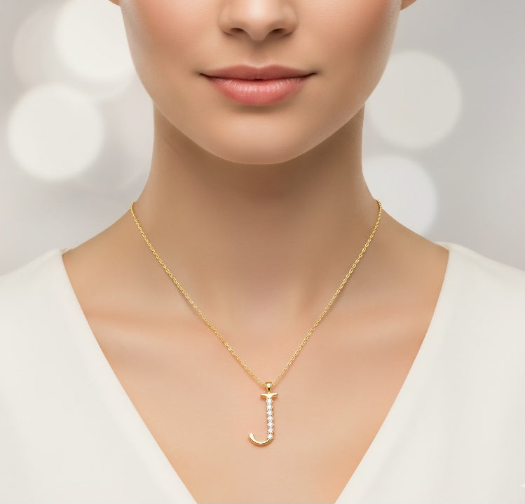 Verleihen Sie Ihrem Stil eine individuelle und luxuriöse Note mit dieser eleganten Halskette mit dem Buchstaben-Anhänger „J“. Das Schmuckstück ist aus feinstem 14-karätigem Gelbgold gefertigt, dessen warmer Glanz die geschwungene Form des Buchstabens perfekt betont. Der Anhänger ist mit fünf funkelnden, echten Diamanten besetzt, die sorgfältig im Brillantschliff veredelt wurden, um ein Maximum an Strahlkraft zu garantieren.